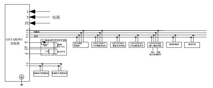 GST-QKP01火災報警控制器、氣體滅火控制器(簡稱為GST-QKP01)是海灣公司為適應工程設計的需要而開發的。GST-QKP01為典型的氣體滅火控制裝置,可配接感煙/感溫/火焰探測器、手動報警按鈕、緊急啟/停按鈕、聲光警報器、氣體噴灑指示燈、手自動轉換開關以及輸出模塊等,具有火災探測和氣體滅火控制功能,可實現1個防火區的火災報警和氣體滅火控制。GST-QKP01滿足GB 4717-2005 《火災報警控制器》和GB 16806-2006《消防聯動控制器》中有關氣體滅火控制器的要求,為室內使用設備。