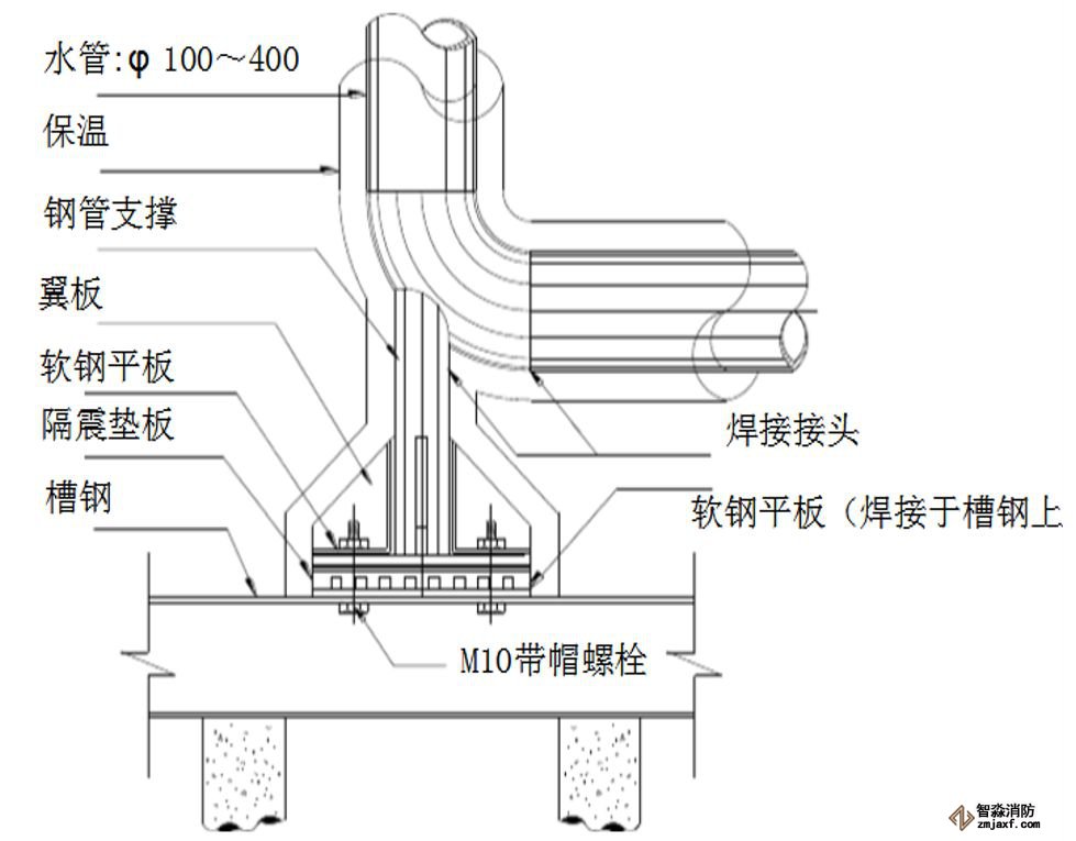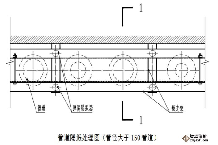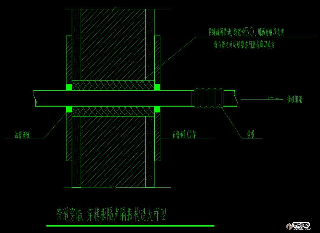 3. 在管路的支吊架、穿墻處使用非燃軟性材料填充做減振處理。