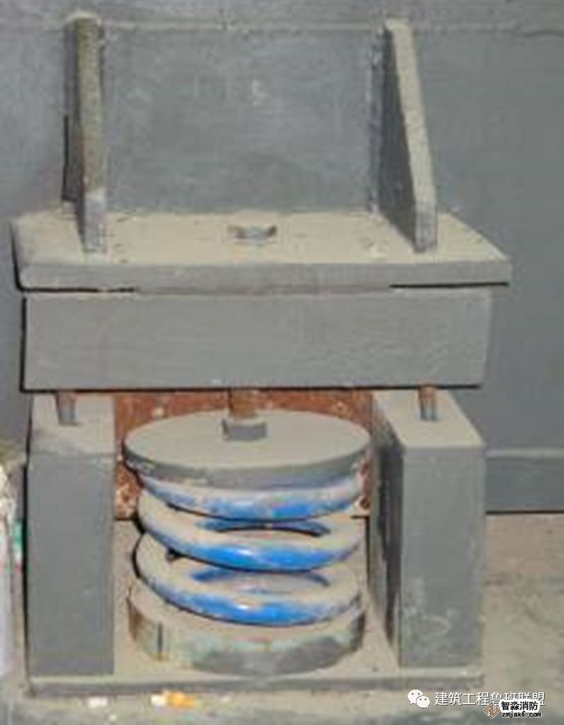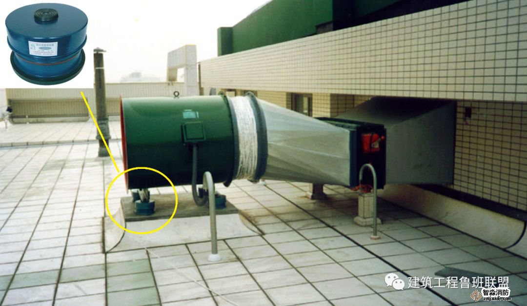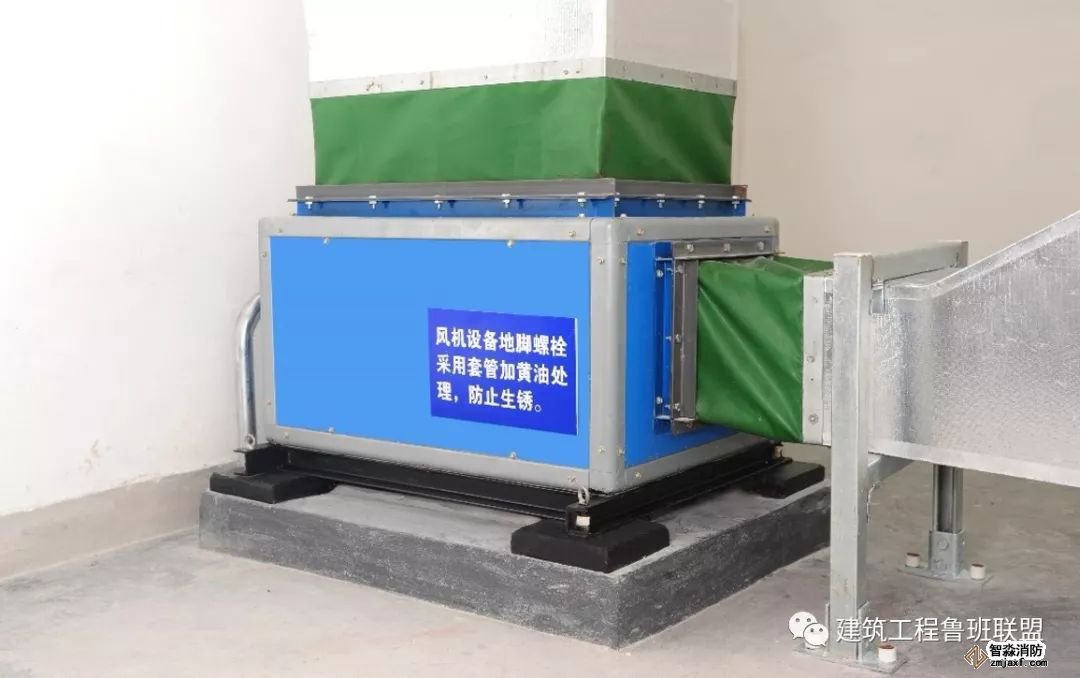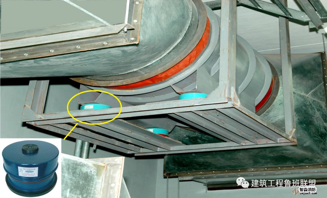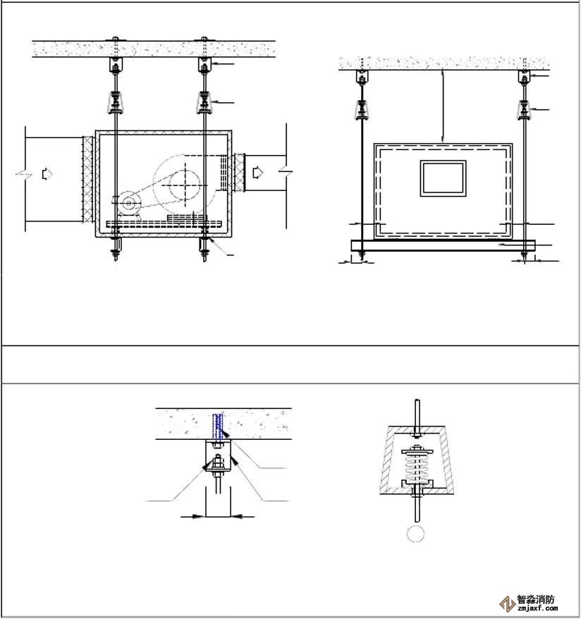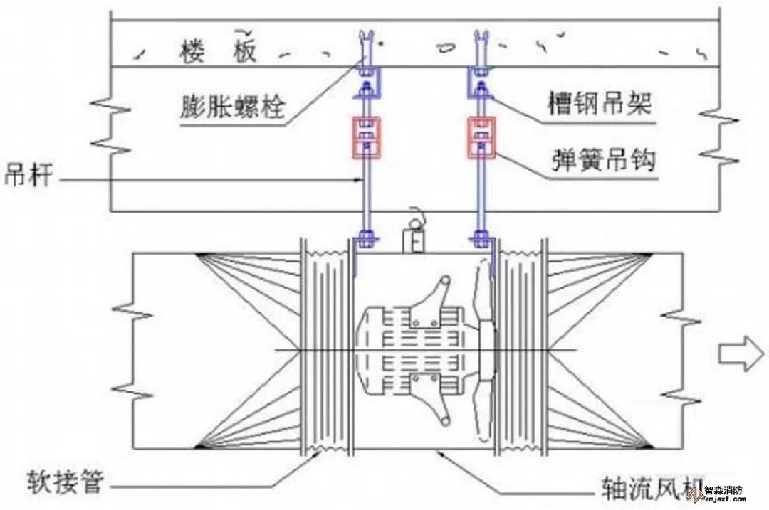 為防止軸流風機工作時擺動,用槽鋼做成框架固定在樓板上,圖為排風兼排煙風機下部設置阻尼彈簧減震器