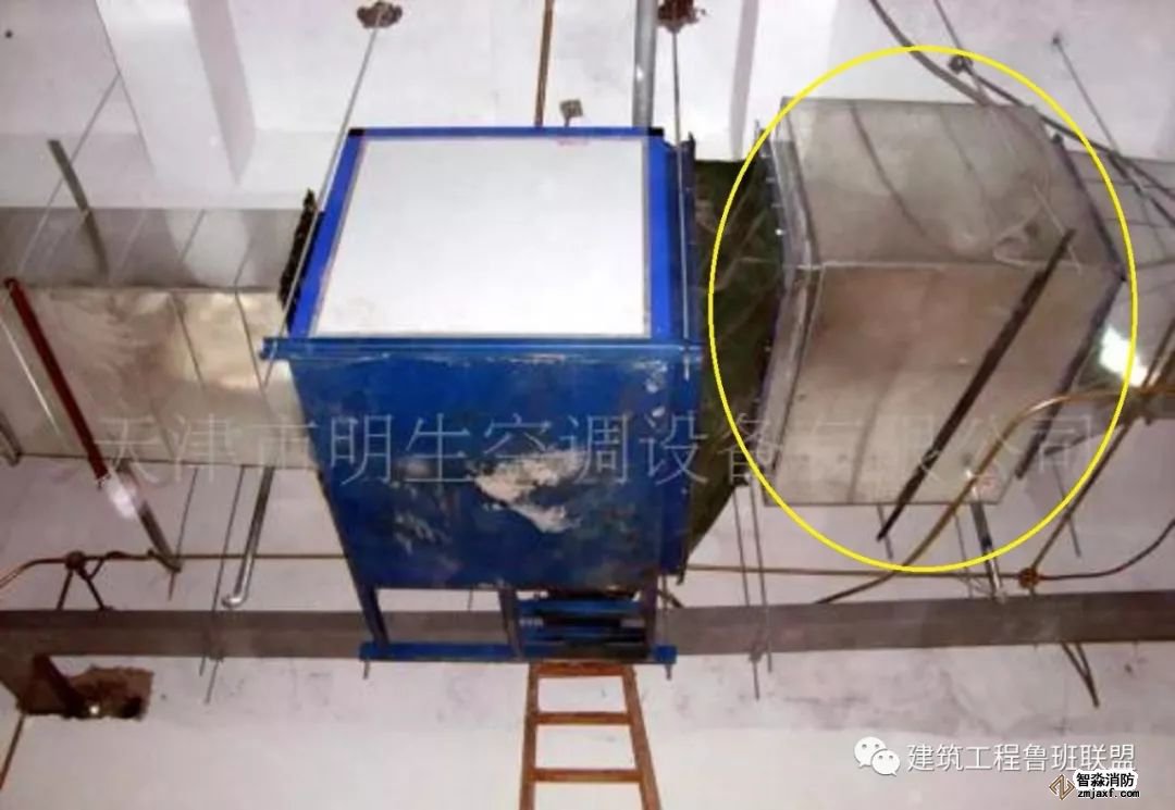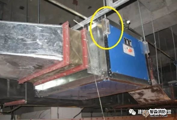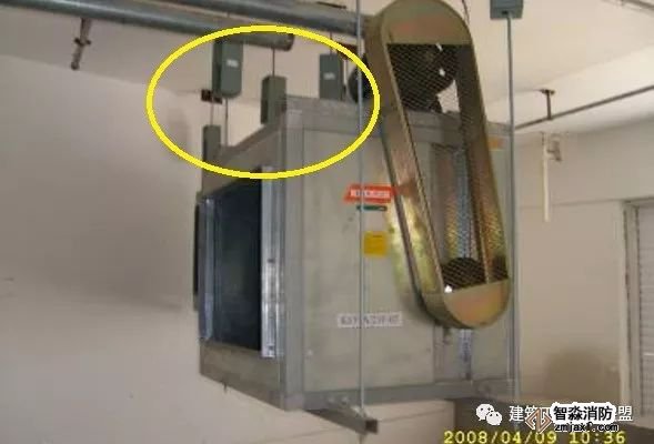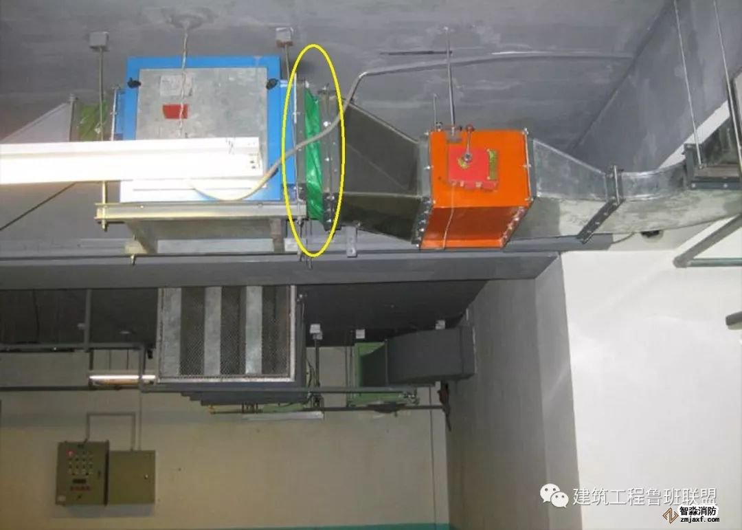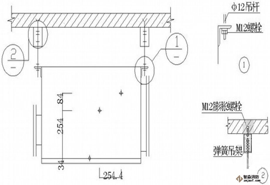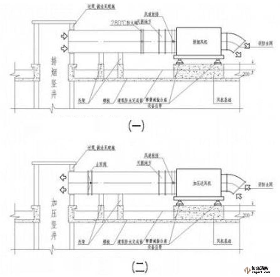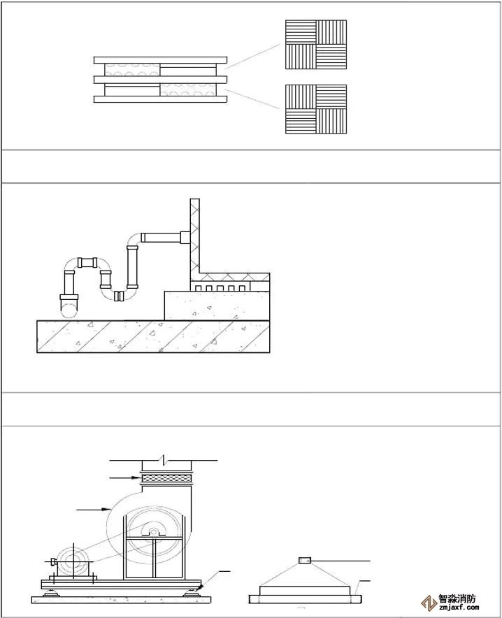 為防止軸流風機工作時擺動,用槽鋼做成框架固定在樓板上,圖為排風兼排煙風機下部設置阻尼彈簧減震器