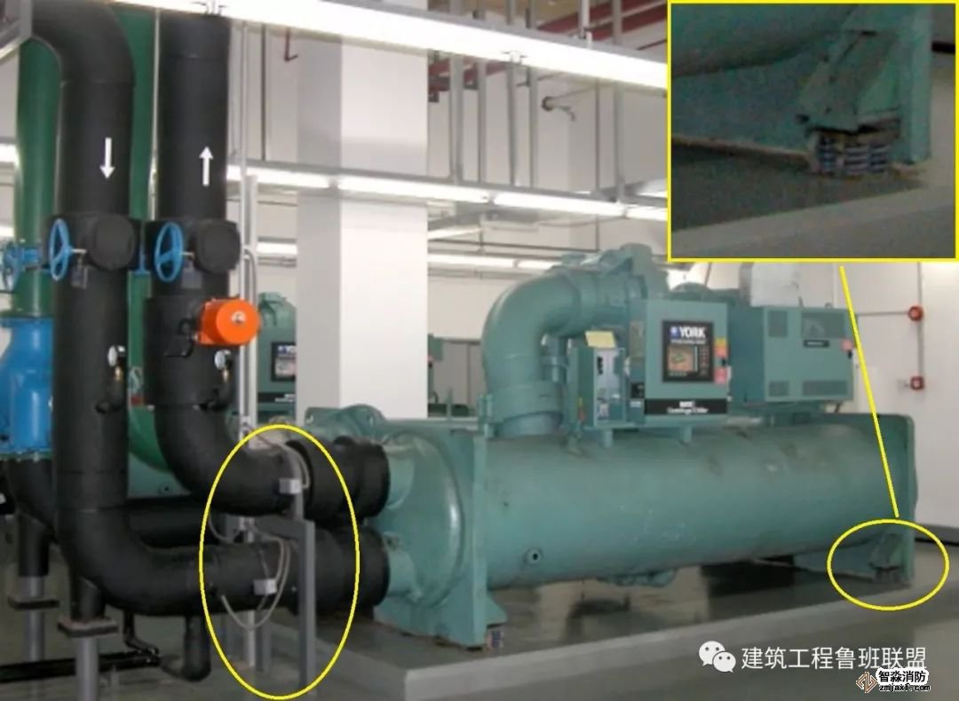 冷水機組底座設置彈簧減震器,落地支架應安裝在柔性短管的后側