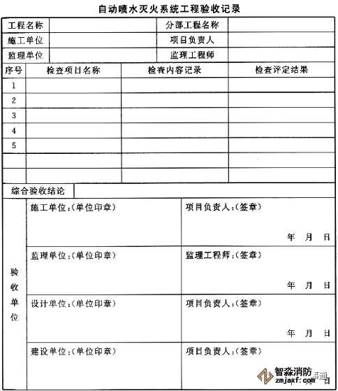2、自動(dòng)噴水滅火系統(tǒng)工程驗(yàn)收應(yīng)按自動(dòng)噴水滅火系統(tǒng)工程驗(yàn)收記錄表填寫(xiě)。