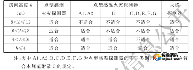 5.2.1 對不同高度的房間,可按表5.2.1選擇點型火災探測器。