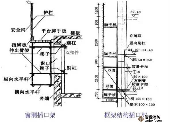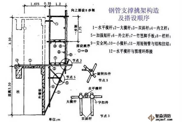 2、利用型鋼擱置在樓層內(nèi)作為底座(樓面擱置長(zhǎng)度大于1.5米,樓層內(nèi)預(yù)埋2道圓鋼錨固型鋼)搭設(shè)鋼管腳手架,同時(shí)用剛纜斜拉,高度不超過(guò)24米或8層。(個(gè)人認(rèn)為也有浪費(fèi)嫌疑,完全可以通過(guò)計(jì)算定下型鋼和圓鋼規(guī)格,不考慮斜拉。不過(guò)安全系數(shù)高,可以考慮)