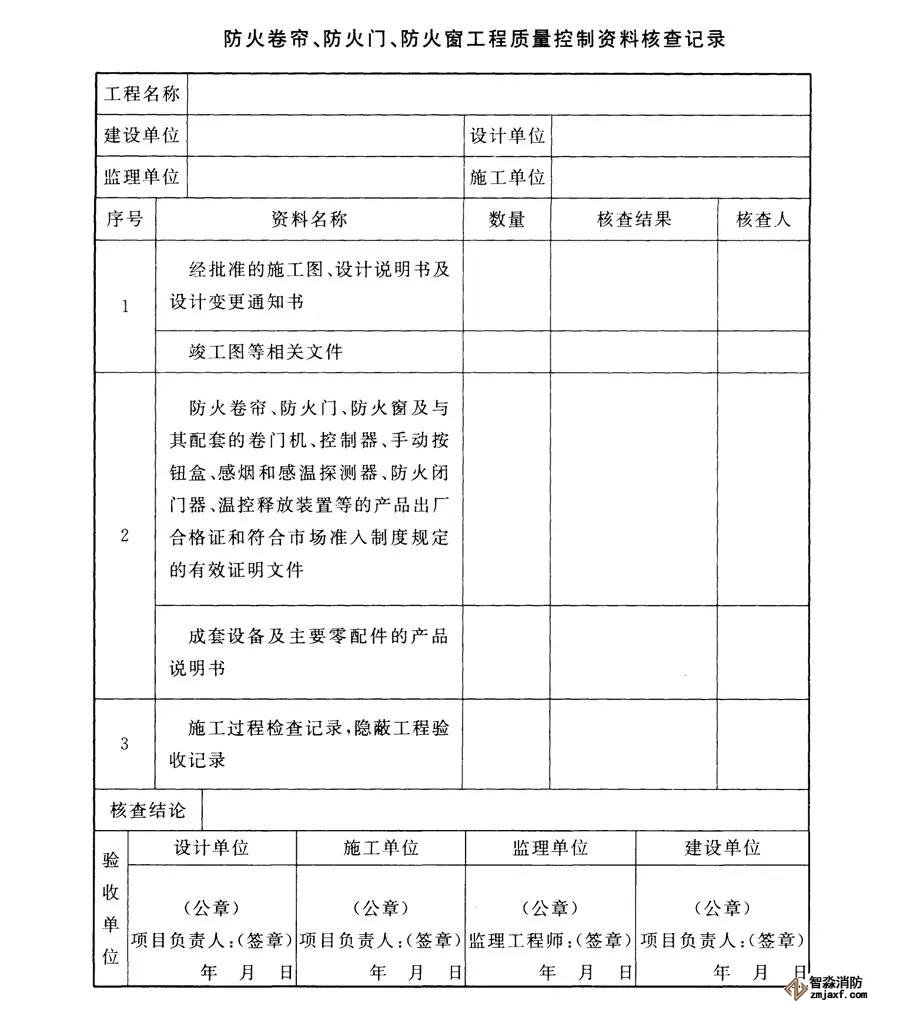2、防火卷簾、防火門、防火窗工程質量驗收前,施工單位應提供下列文件資料,并應按下表填寫資料核查記錄: