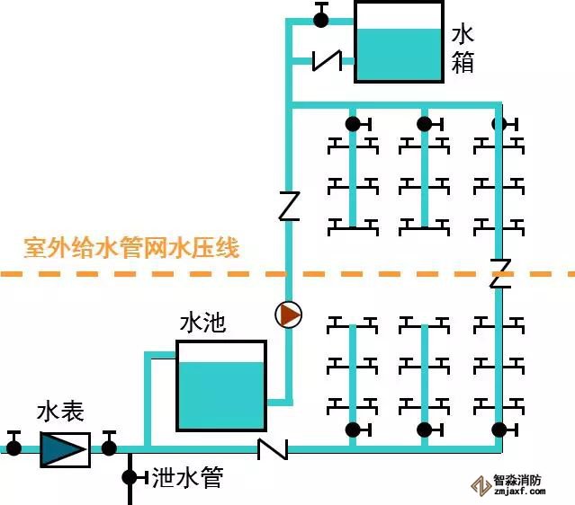 適用場所:供水壓力只能滿足建筑下層供水要求時采用。