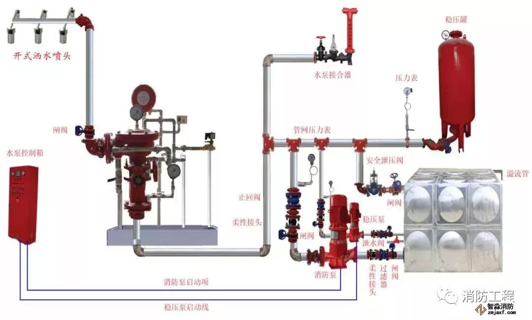 預作用系統在準工作狀態時配水管道內不充水,由火災自動報警器自動開啟預作用閥后,轉換為濕式系統,預作用系統由閉式噴頭、預作用閥組、充氣設備(不是必須有)、水流報警裝置、供水設施及供水配水管道等組成。