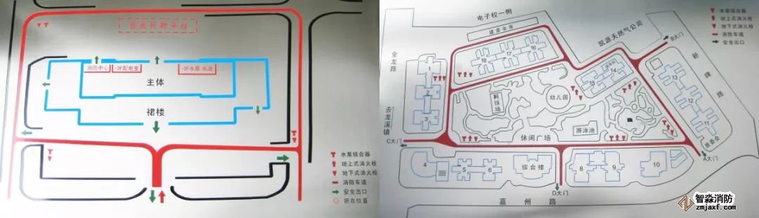 設置要求:在建筑大門口左側或住宅小區(廠區、庫區)主入口處的醒目位置應設置XX建筑消防總平面布局圖。主要包括建筑(住宅小區、廠區、庫區等)總平面布局圖、消防車道、撲救面、室外消火栓、水泵結合器、消防控制室位置、建筑通向室外的主要出口、以及住宅小區(廠區、庫區等)通向外部的出入口等內容。