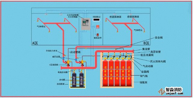 該系統由滅火劑儲存裝置、總控閥、驅動器、噴頭、管道超壓泄放裝置、信號反饋裝置、控制器等組成。