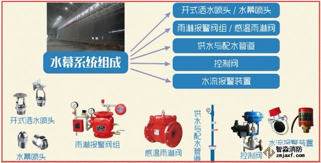 水幕系統由開式灑水噴頭或水幕噴頭、雨淋報警閥組或感溫雨淋閥、供水與配水管道、控制閥以及水流報警裝置(水流指示器或壓力開關)等組成。