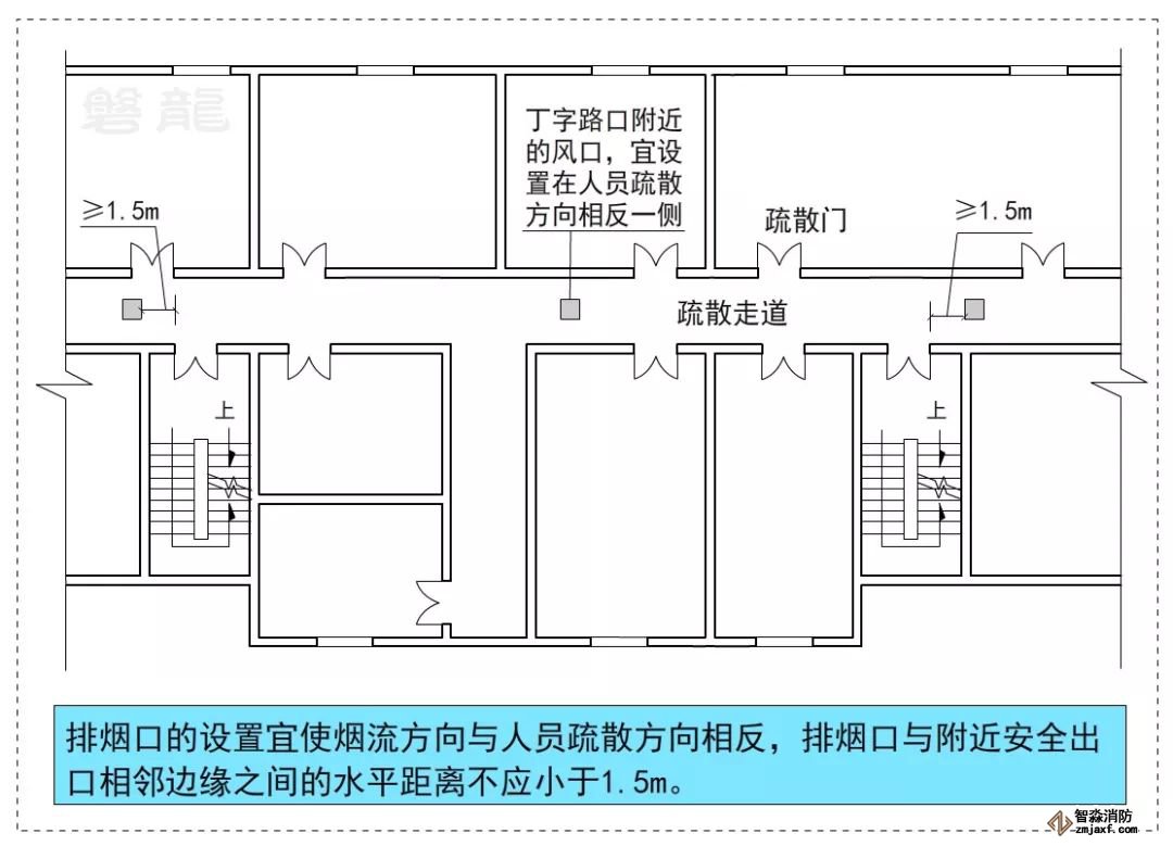 對于T字形或回形疏散走道,必須輔以正確的疏散指示標志和應急照明系統,對于設置機械排煙系統的疏散走道,排煙口的設置宜使煙流方向與人員疏散方向相反。