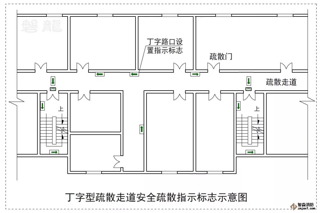 疏散走道的疏散指示標志設置,應與對應的疏散路徑相對應,疏散指示標志應指向最近的疏散路徑。圖示10的丁字形路口,需增設指示標志,指向疏散距離較短的方向: