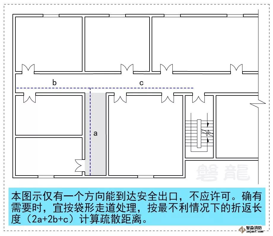 注:本圖示僅有一個方向能到達安全出口,不應許可。確有需要時,宜按袋形走道處理,按最不利情況下的折返長度(2a+2b+c)計算疏散距離。比如,一二耐火等級的高層教學建筑:(2a+2b+c)≤15m。