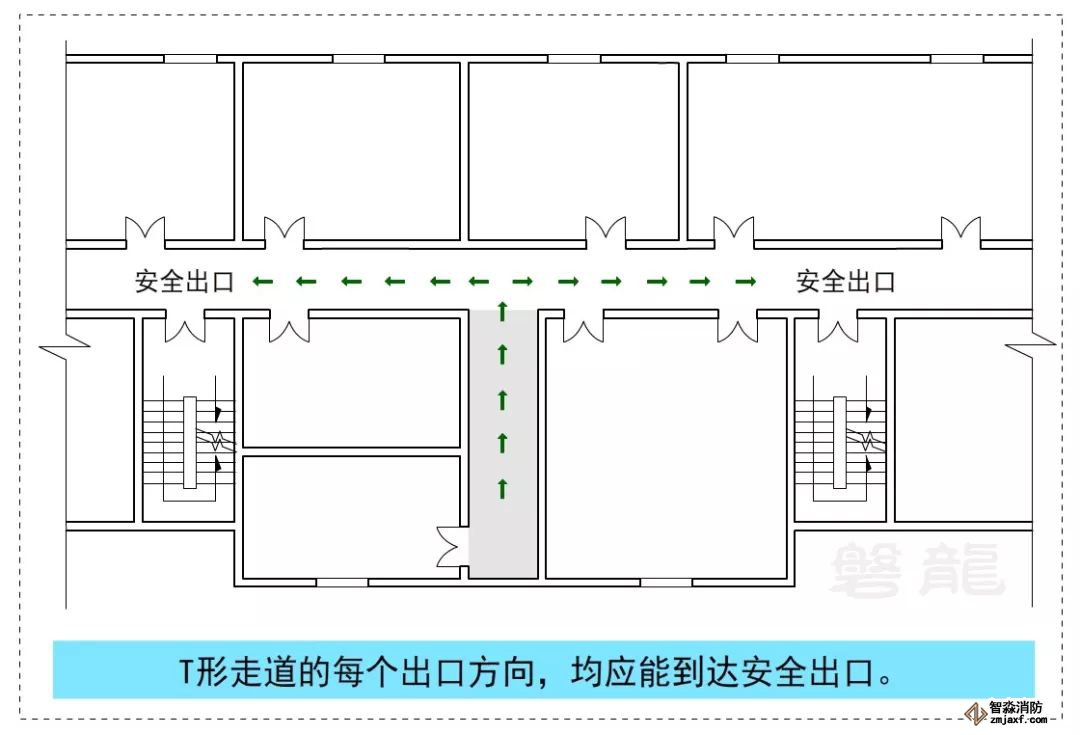 1、T形走道的每個出口方向,均應能到達安全出口。