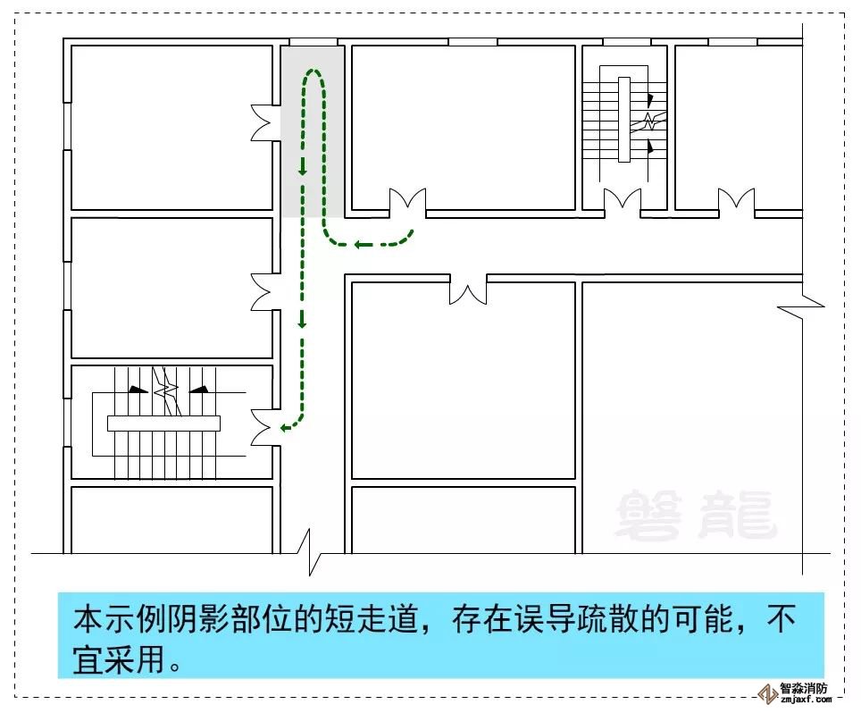 圖示5類似的疏散走道,陰影部位的短走道,存在誤導疏散的可能,不宜采用。確需采用時,應按直線方向行走的疏散習慣,保證a
