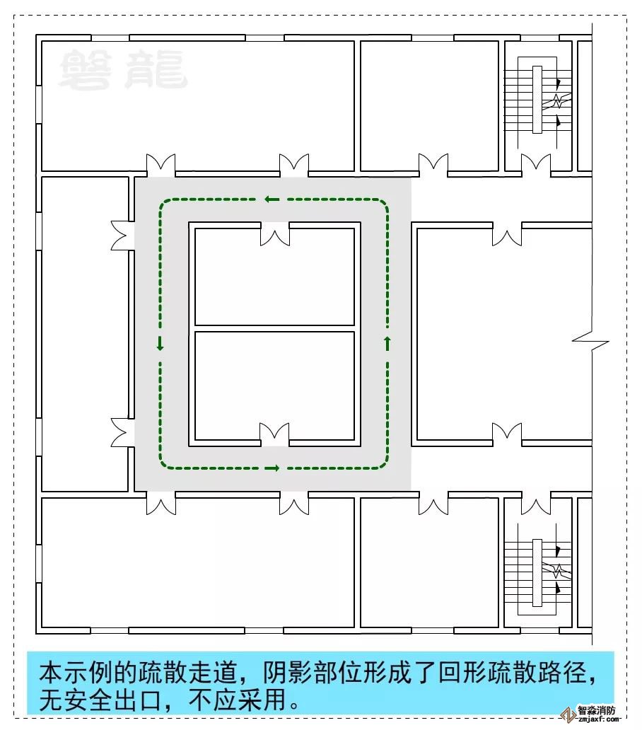 圖示7、圖示8所示的疏散走道,示例部位形成回形疏散路徑,沒有安全出口,不應采用。