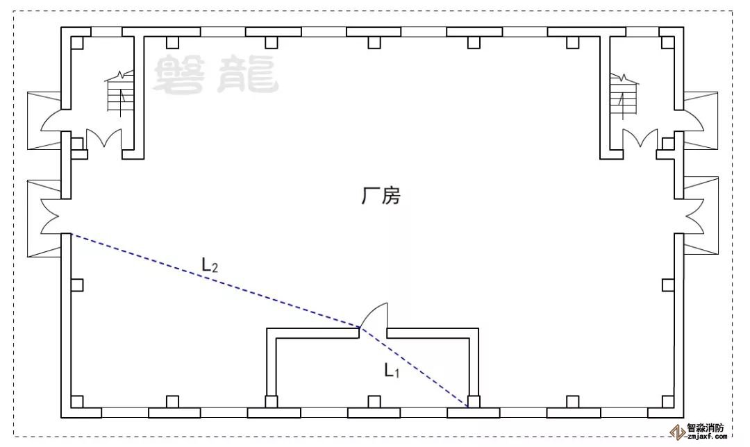 2、廠房倉庫同樣不應(yīng)采用嵌套(穿套)設(shè)置的方式,確因功能需要,嵌套(穿套)設(shè)置的房間不應(yīng)超過一級,疏散距離應(yīng)按人員行走的直線距離計(jì)算,在圖示6的廠房中,示例房間內(nèi)任一點(diǎn)至安全出口的直線距離,應(yīng)為L1+L2。