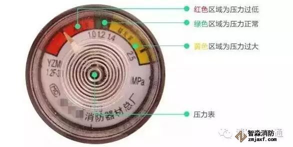 2、儲壓式滅火器壓力符合要求,壓力表指針在綠區(qū);