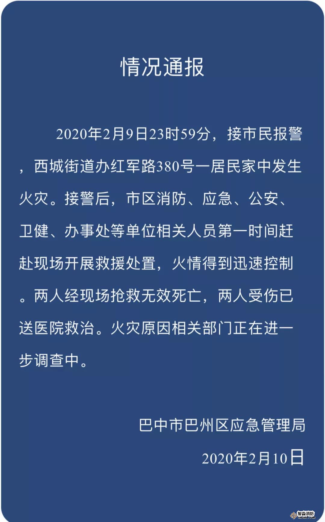 2月9日23時59分,巴中市巴州區紅軍路380號1單元2樓發生火災,造成2人死亡,2人受傷。