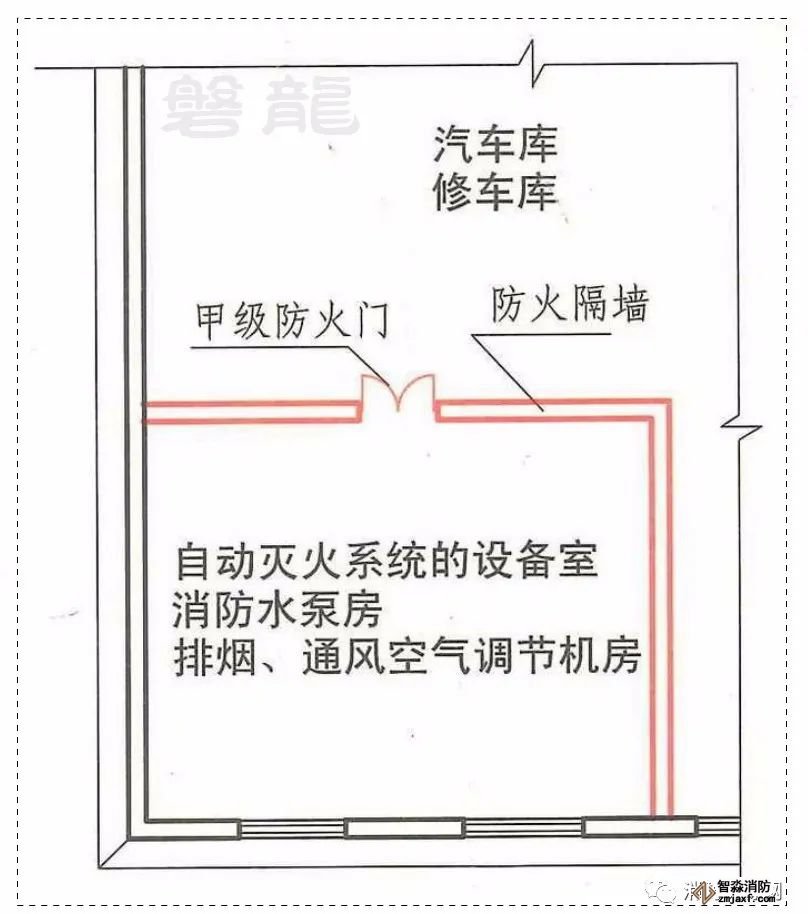附設在汽車庫、修車庫內,且主要為其服務的自動滅火系統的設備室、消防水泵房和排煙、通風空氣調節機房等,疏散門可以向汽車庫或修車庫開啟(詳見圖示5.1.9),這些設備用房是汽車庫的附屬功能用房,屬于汽車庫防火分區的一部分,不屬于借用和共用疏散樓梯間的概念。