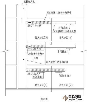 4.當排煙管道豎向穿越防火分區時,垂直風道應設在管井內,且排煙井道必須要有1.00h的耐火極限。當排煙管道水平穿越兩個及兩個以上防火分區時,或者布置在走道的吊頂內時,為了防止火焰燒壞排煙風管而蔓延到其他防火分區,要求排煙管道應采用耐火極限1.50h的防火風道,其主要原因是耐火極限1.50h防火管道與280℃排煙防火閥的耐火極限相當,可以看作防火閥的延伸,另外,可以精簡防火閥的設置,減少誤動作,提高排煙的可靠性。