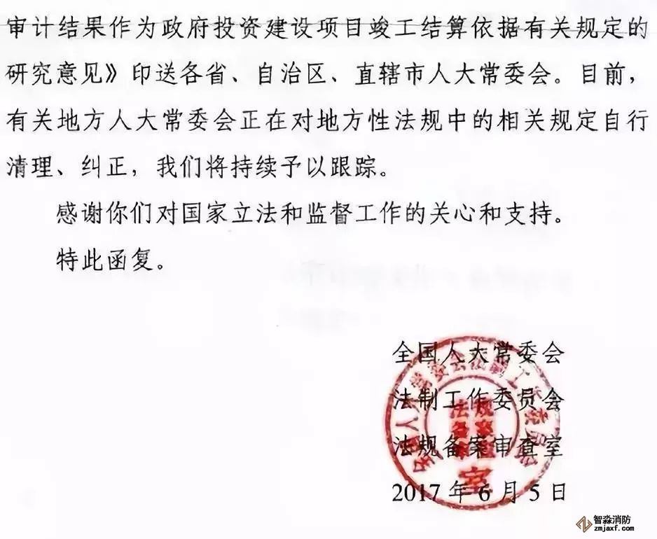 全國人大常委會法工委在回復中國建筑業(yè)協(xié)會《關于對地方性法規(guī)中以審計結(jié)果作為政府投資建設項目竣工結(jié)算依據(jù)有關規(guī)定提出的審查建議的復函》中提出,地方性法規(guī)中直接以審計結(jié)果作為竣工結(jié)算依據(jù)和應當在招標文件中載明或者在合同中約定以審計結(jié)果作為竣工結(jié)算依據(jù)的規(guī)定,限制了民事權(quán)利,超越了地方立法權(quán)限,應當予以糾正。且法工委已將研究意見印送各省、自治區(qū)、直轄市人大常委會。目前,有關地方人大常委會正在對地方性法規(guī)中的相關規(guī)定自行清理、糾正。