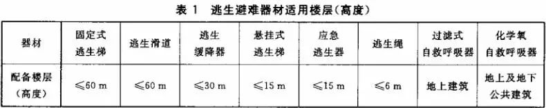 (1)逃生滑道、固定式逃生梯應配備在不高于60m的樓層內;逃生緩降器應配備在不高于30m的樓層內;懸掛式逃生梯、應急逃生器應配備在不高于15m的樓層內;逃生繩應配備在不高于6m的樓層內。地上建筑可配備過濾式自救呼吸器或化學氧自救呼吸器,高于30m的樓層內應配備防護時間不少于20min的自救呼吸器。地下建筑應配備化學氧自救呼吸器。逃生避難器材配備樓層(高度)見下表。