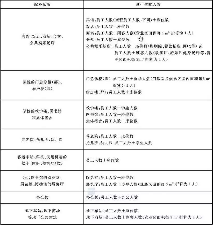 (2)各類場所的逃生避難人數及逃生避難器材可救助人數的計算方法參見下表。