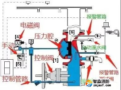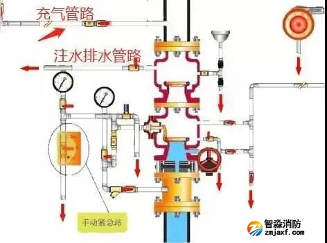 預作用閥組,從結構上是雨淋閥與濕式閥的組合。其管路以及功能上和濕式閥和雨淋閥的設置以及功能均相同。為什么預作用閥組上部一定要配一個濕式報警閥,主要原因是系統側充有有壓氣體,需要濕式報警閥來實現密封氣體。