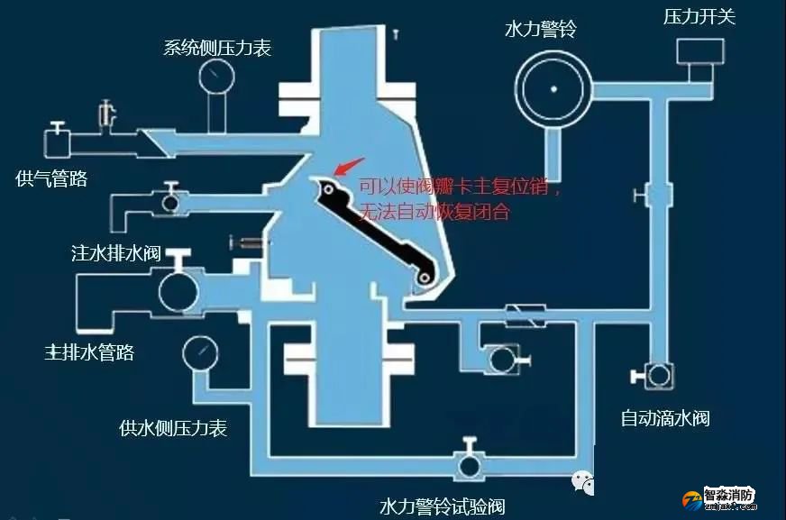 5)試驗結束或者火災撲救完之后,系統側的水全部從主排水管路排出(此時閥瓣仍是開啟狀態,被復位銷卡住無法返回)。