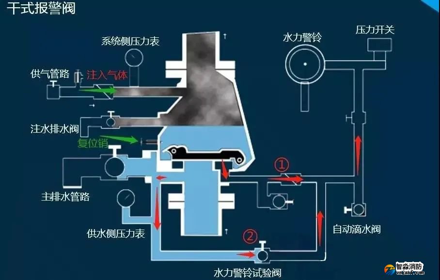 3)圖示中路線①為報警路線,發生火災后閥瓣開啟,水流進入報警管路(后續和濕式一致不再重復)。這里關鍵是當閥瓣開啟后由于干式報警閥閥瓣的前端結構,使其可以順時針通過復位銷,而無法逆時針自動復位(會卡在復位銷位置)。