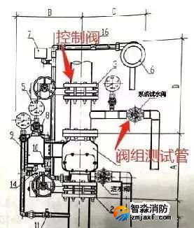 4)圖示路線②為報警管路測試管路,只需按照②路線開啟水力警鈴試驗閥,即可不開啟閥瓣從而測試報警功能。